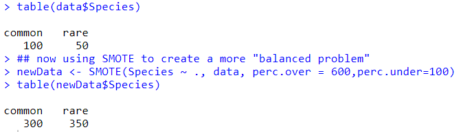 newData <- SMOTE(Species ~ ., data, perc.over = 600,perc.under=100)
